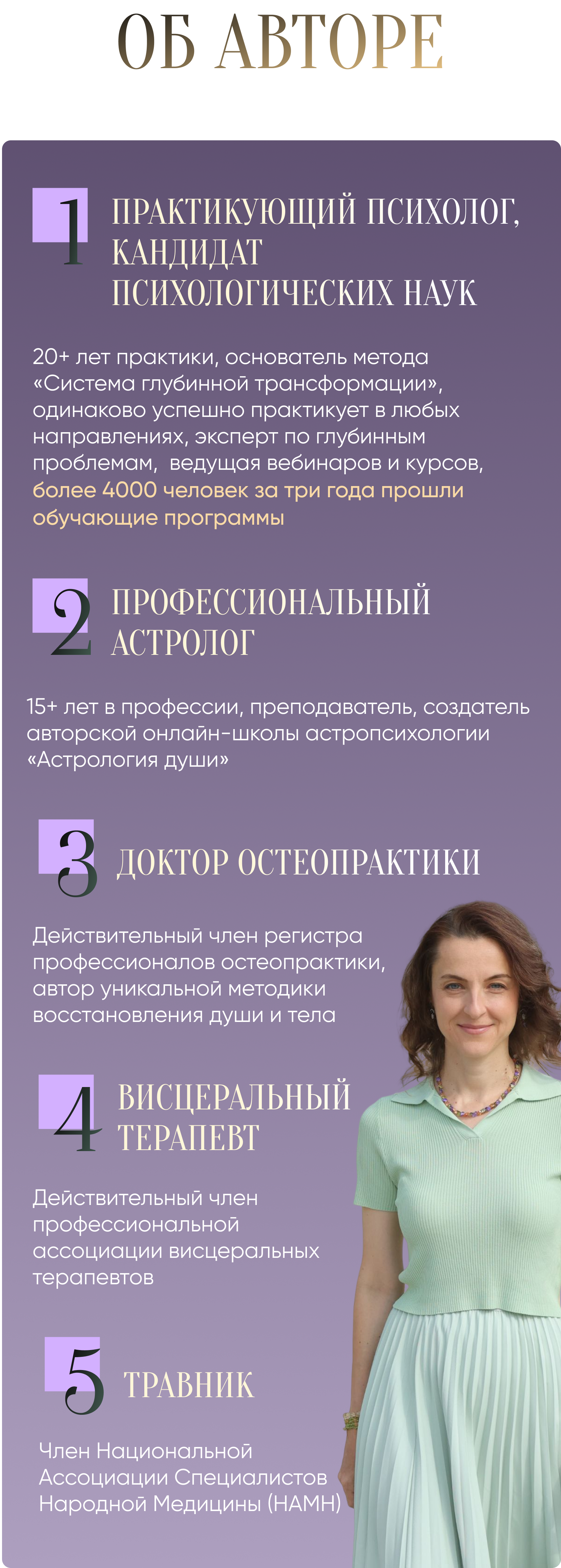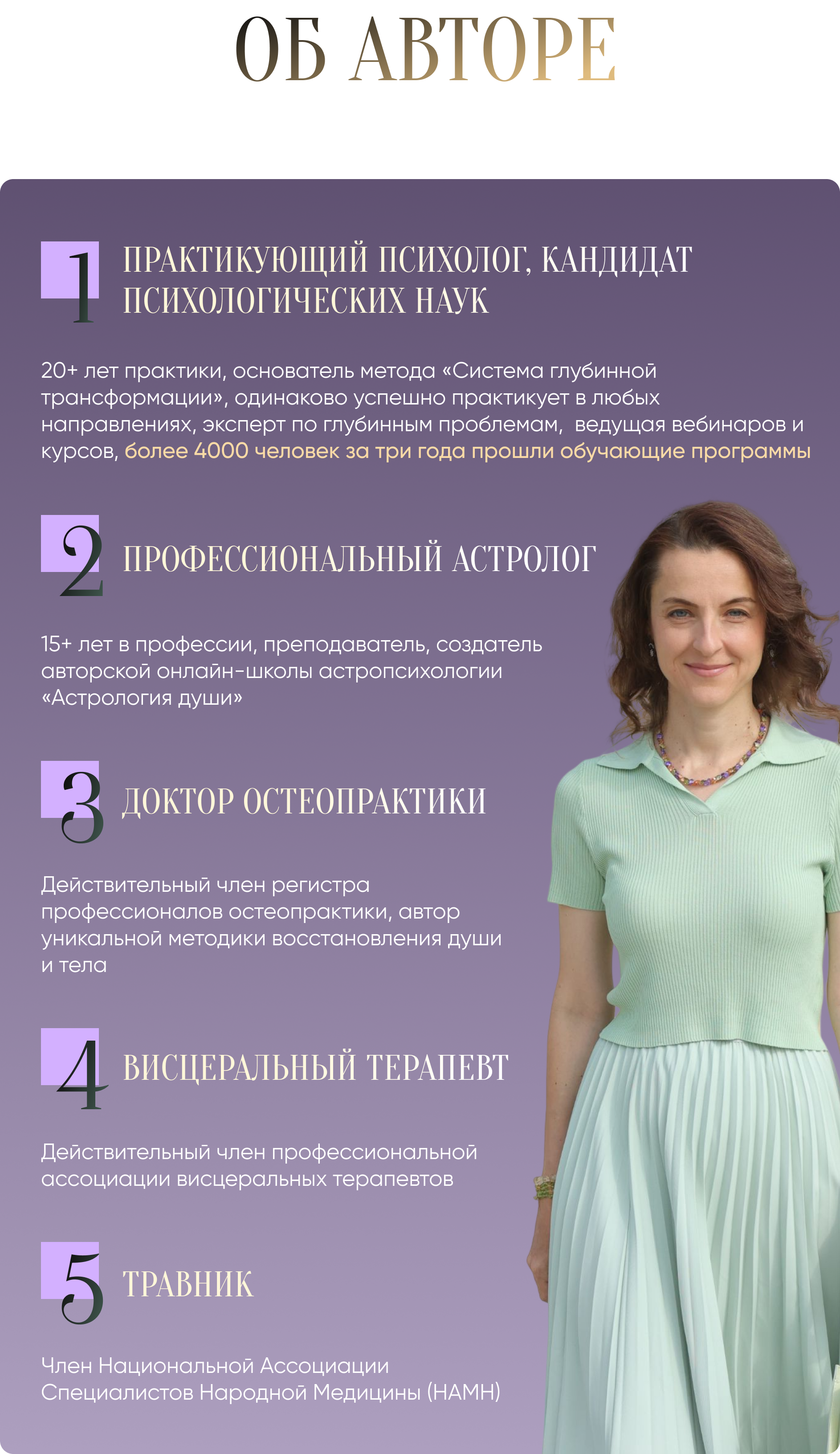 20+ лет практики, основатель метода «Система глубинной трансформации», одинаково успешно практикует в любых направлениях, эксперт по глубинным проблемам, ведущая вебинаров и курсов, более 4000 человек за три года прошли обучающие программы